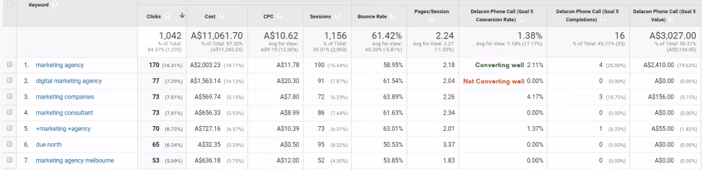 • See exactly how many phone leads are coming into a business, e.g. what marketing campaigns are generating what leads, right down to detailed levels. For example, we can see that this keyword in Google Ads generated 62 enquiries, this keyword generated zero phone enquiries. Last month’s email campaign generated no enquiries, the one before generated 20 enquiries.