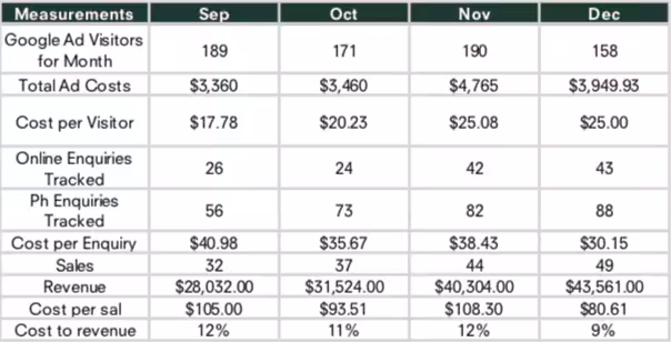 Google Ads spend, leads generated, leads closed, revenue generated.