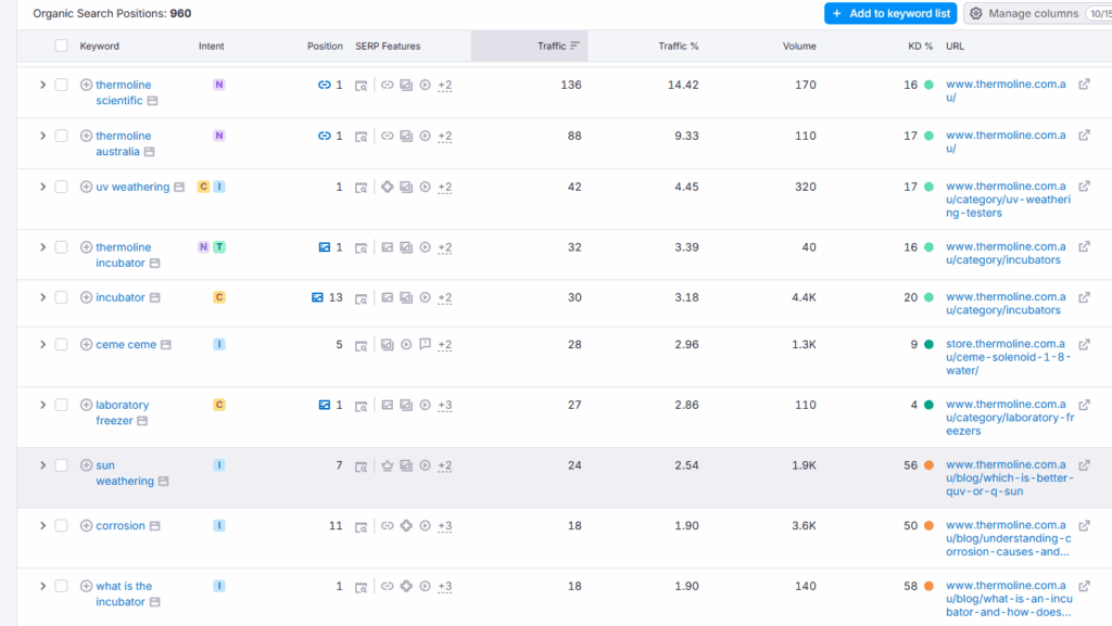 Next, evaluate what’s driving your results. For instance, I was speaking with a lead from Thermalign, and when we looked at their organic traffic over the past 12 months, there was no growth. That’s a red flag. To produce organic results, you need strong keyword rankings. However, in their case, there was no improvement in keyword rankings either, which indicates their current efforts aren’t delivering the desired results.