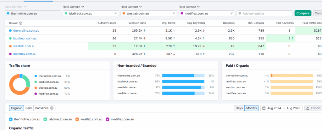 Finally, compare your performance to your competitors. For example, Thermalign’s competitors like West Lab and LabDirect have higher visitor numbers and more organic keywords ranking, even if their authority scores are similar. This shows there’s significant opportunity to improve the website’s content and rankings to drive more traffic and leads.